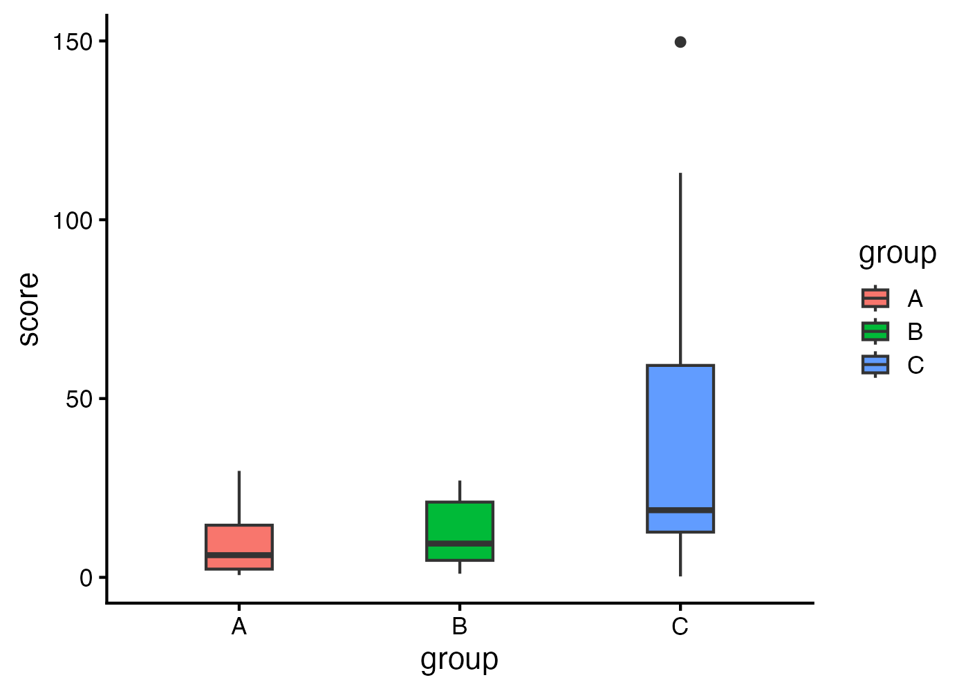 as.data.frame(main_B_summary), as.data.frame(main_B_eff))ARTでは元のデータを整列・順位変換したデータに基づいて検定を行います。したがって、箱ひげ図などで元データをそのまま表示した結果と、ARTの事後検定の結果が不整合であるように見える場合があります(図では差がないように見えるのに検定結果では差があるなど)。